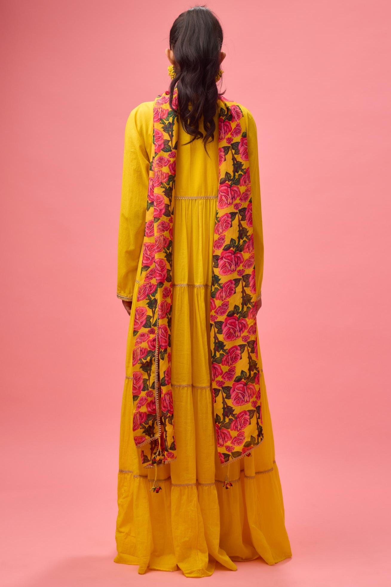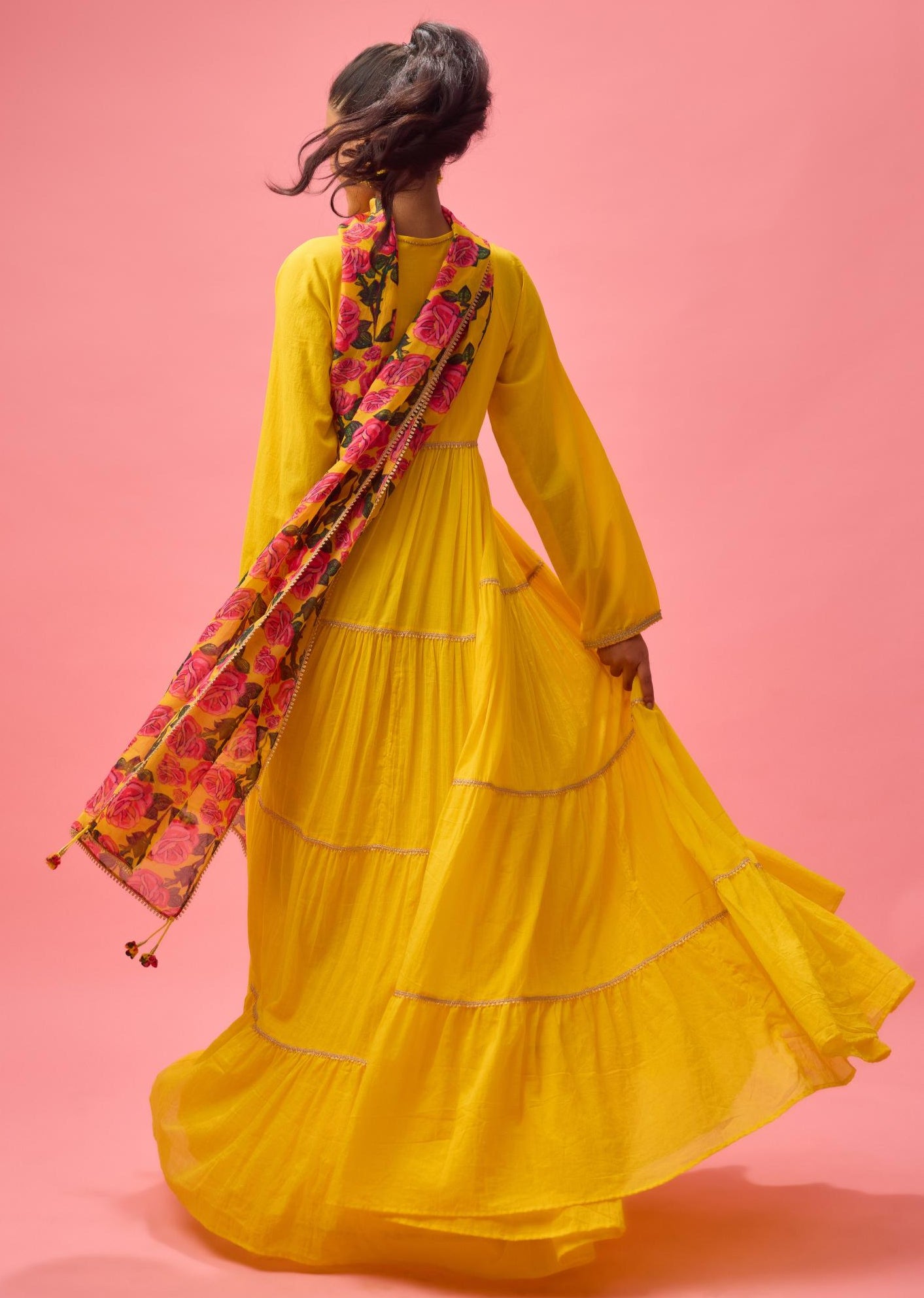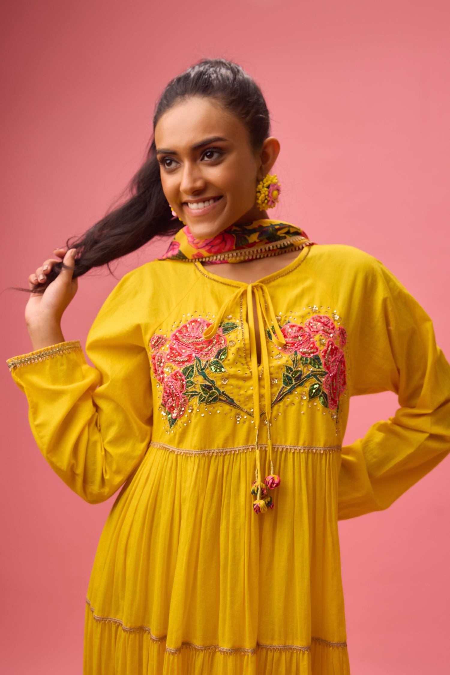 Yellow rose applique kalidar paired with printed dupatta and churidar