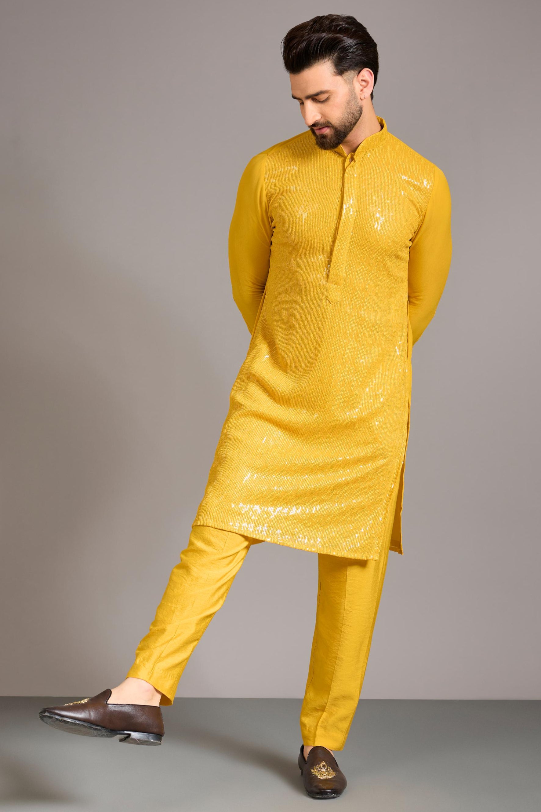 The Yellow Sequin Lined Kurta Set is a radiant blend of vibrant yellow and shimmering sequins, making it a perfect choice for festive occasions. The intricate sequin detailing adds a touch of glamour to the bright hue, while the fluid silhouette offers comfort and elegance. Ideal for both day and evening events, this kurta set is a statement of joyful sophistication. With its lively color and stunning embellishments, it's sure to light up any celebration with ease.