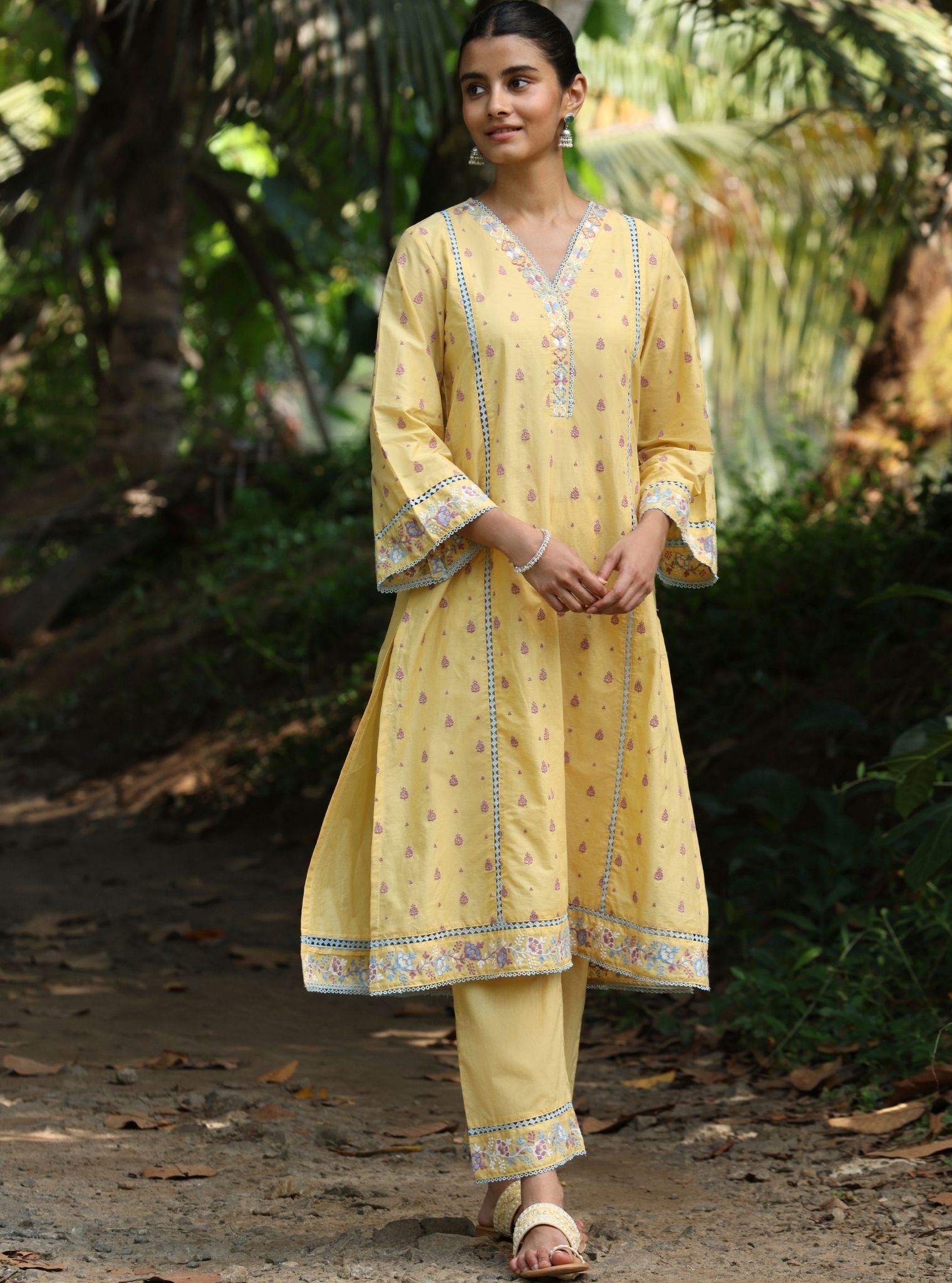 The Yellow Shira Malgudi Day Kurta Set radiates warmth and joy with its vibrant yellow color and intricate handblock prints. Crafted from soft, breathable fabric, it offers a relaxed fit for all-day comfort and effortless style. Perfect for casual outings or special occasions, this set combines traditional craftsmanship with a modern silhouette. A bold yet timeless piece, it's ideal for those who embrace color and seek a graceful, contemporary twist on heritage design.