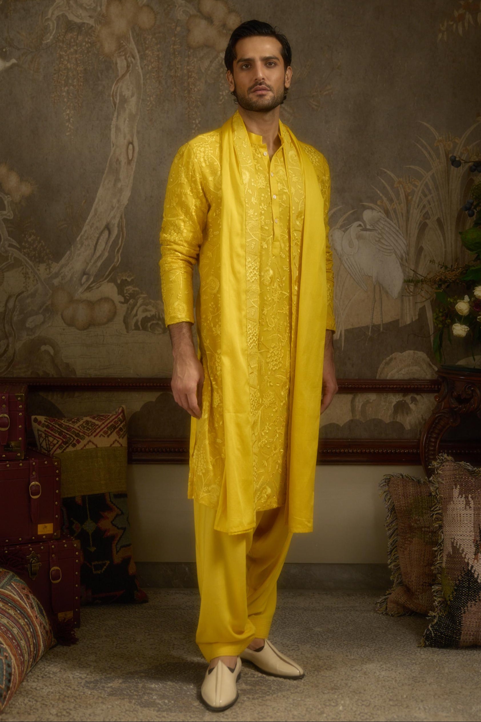 The Yellow Stardust Heerbasant Kurta radiates the spirit of spring with its joyful marigold hue and delicate heritage-inspired embroidery. “Heer” symbolises love and elegance, while “Basant” celebrates the vibrant season of bloom—captured beautifully in this design. Tailored in lightweight, breathable fabric, it’s ideal for haldi functions, festive brunches, or daytime weddings. Pair it with white trousers or churidar to complete the look with grace and brightness.