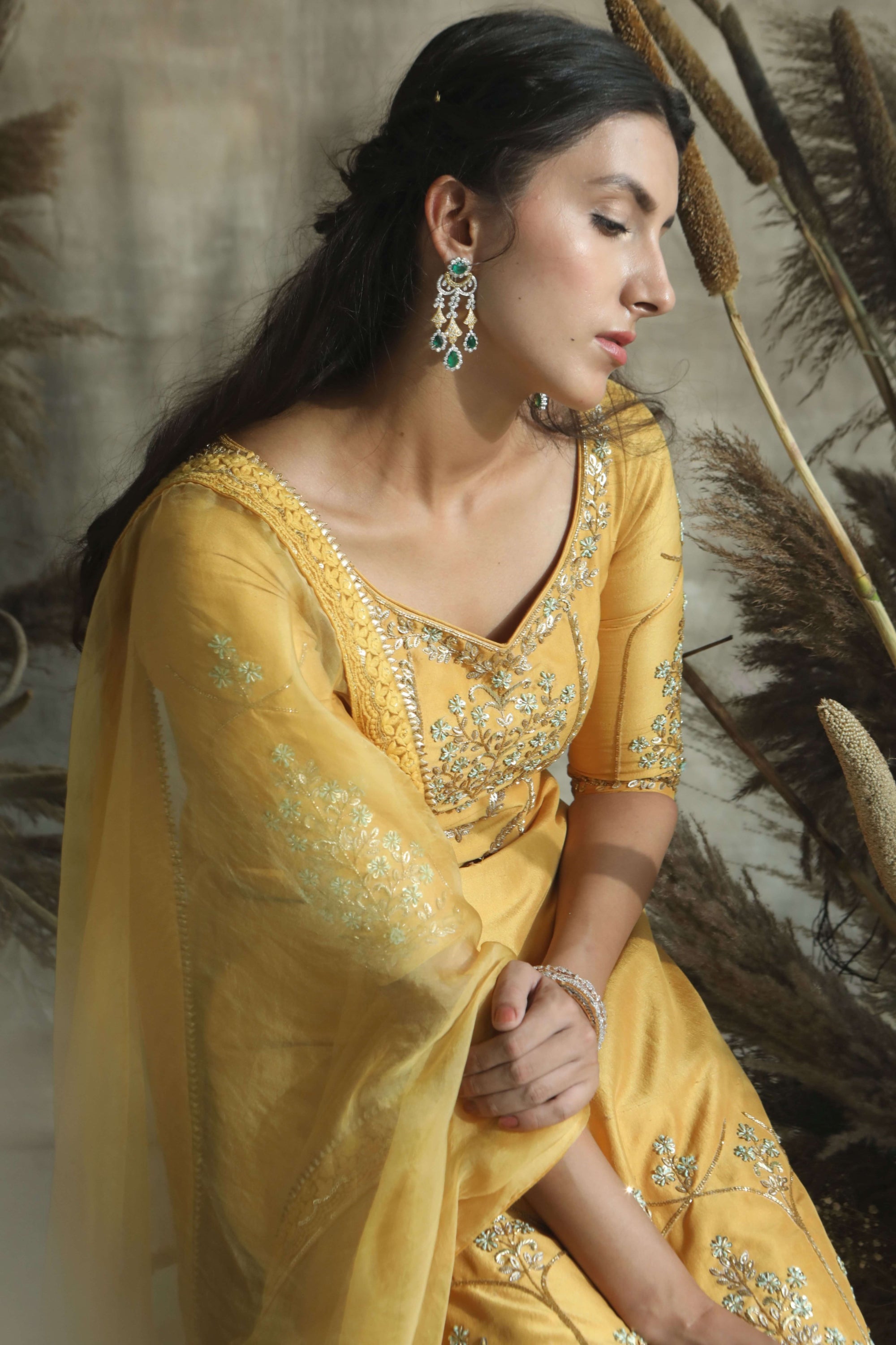 Brighten up your wardrobe with our yellow straight suit, crafted from luxurious silk. This elegant ensemble features a vibrant yellow straight-cut suit that exudes sophistication and modern grace. The outfit is completed with a coordinating organza dupatta that adds an airy, refined touch, and a matching potli bag for a classic finishing detail. Ideal for festive occasions and special events, this set ensures you make a radiant and memorable impression with its lively color and exquisite craftsmanship.
