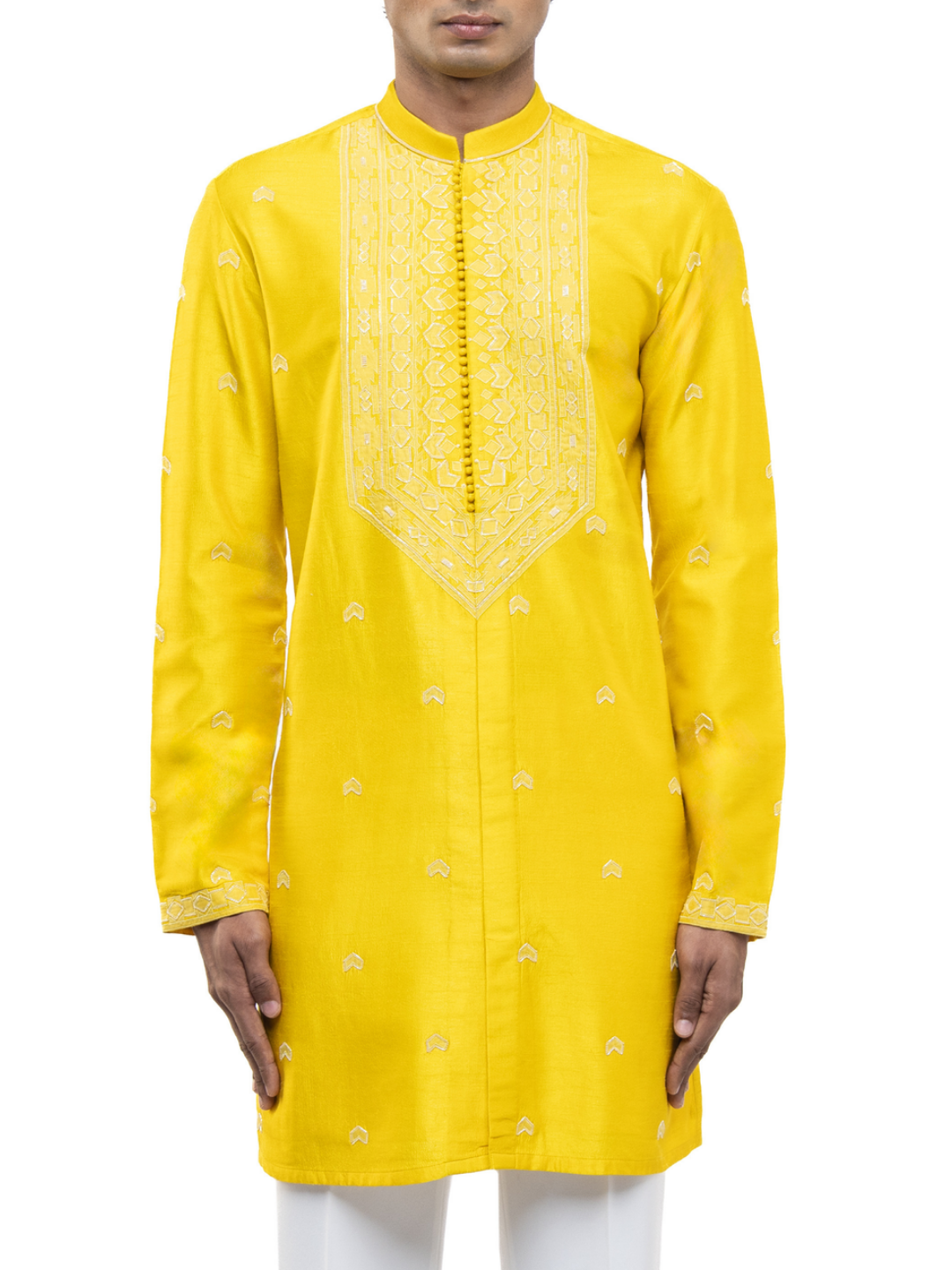 Bright and elegant, this Yellow & White Hand Embroidery Kurta Set radiates festive charm. Crafted from fine silk, the kurta features delicate white hand embroidery that beautifully contrasts the vibrant yellow base. Designed with a unique bucket cut placket, stand collar, and Mother of Pearl buttons, it offers a refined yet modern appeal. Finished with a straight hem and regular fit, this set is perfect for daytime functions, haldi ceremonies, or summer celebrations.