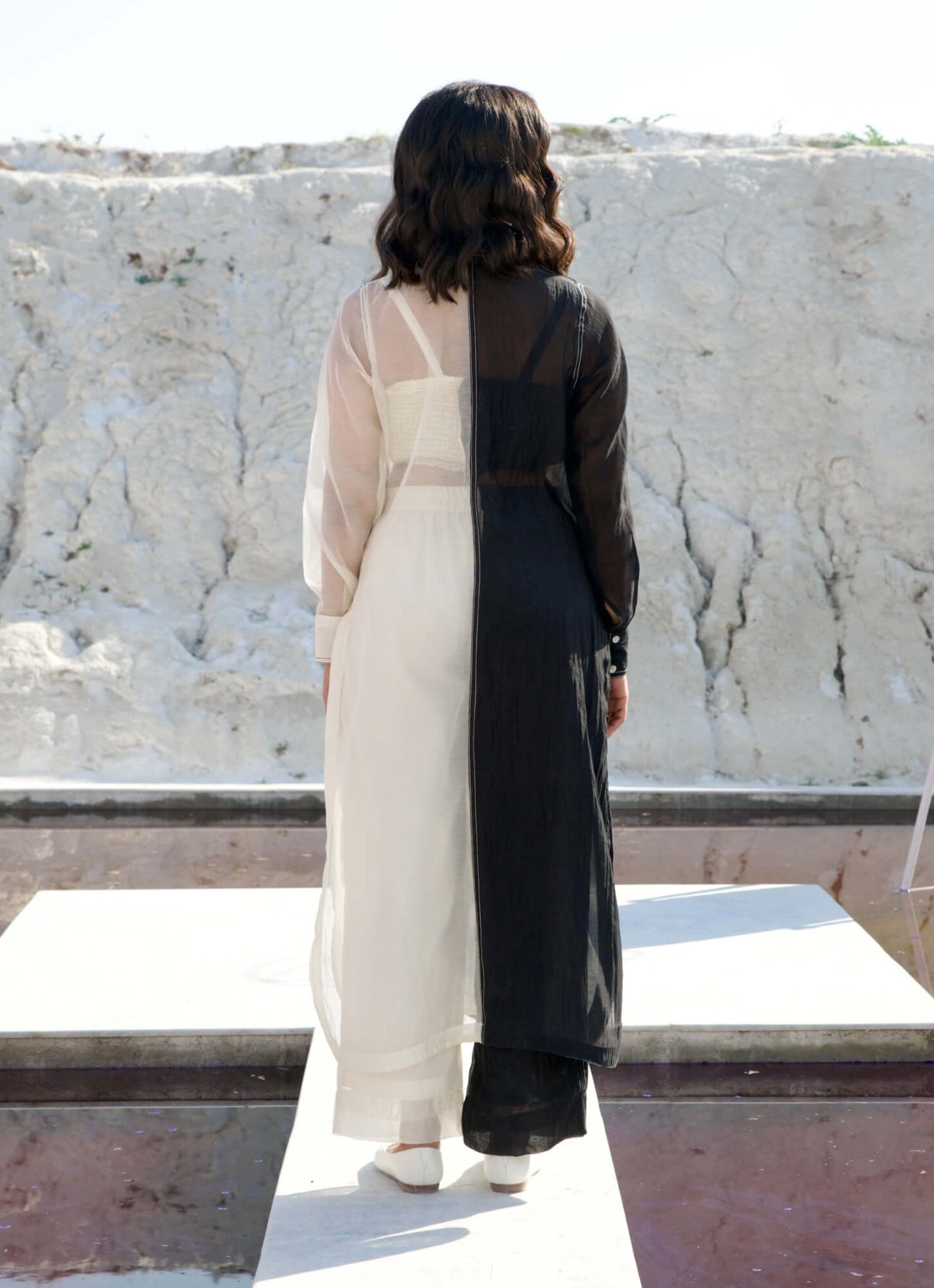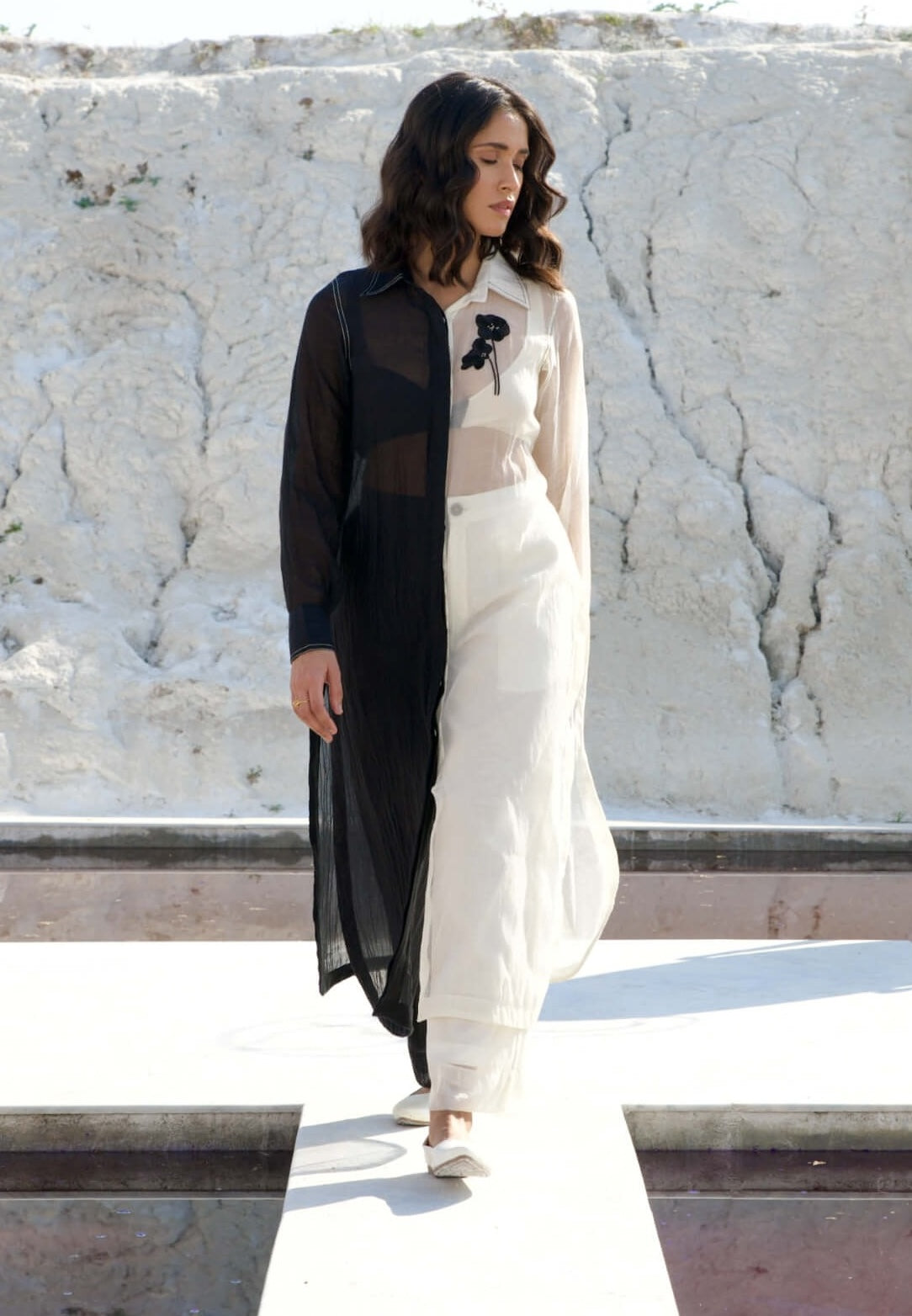 Elevate your style with this luxe chic co-ord set crafted from lightweight chanderi silk. The dual-tone ensemble features a sophisticated blend of black raven and pearl white, with a spread collar, concealed placket, and distinctive denim stitch details. The shirt is adorned with intricate hand-embroidered hibiscus flowers for a touch of elegance. Complete with a twisted bralette and coordinating pants, this set offers a perfect fusion of modern sophistication and timeless grace.