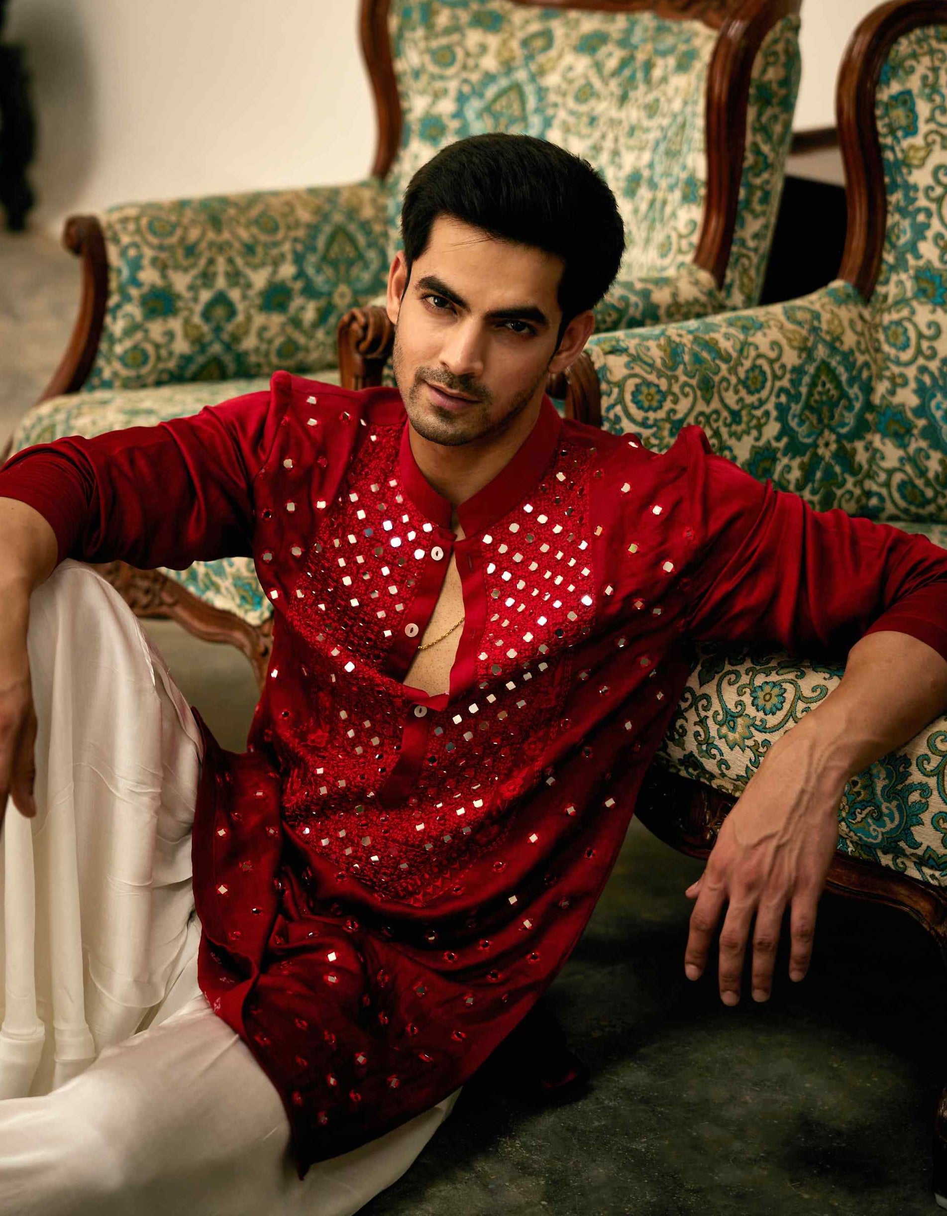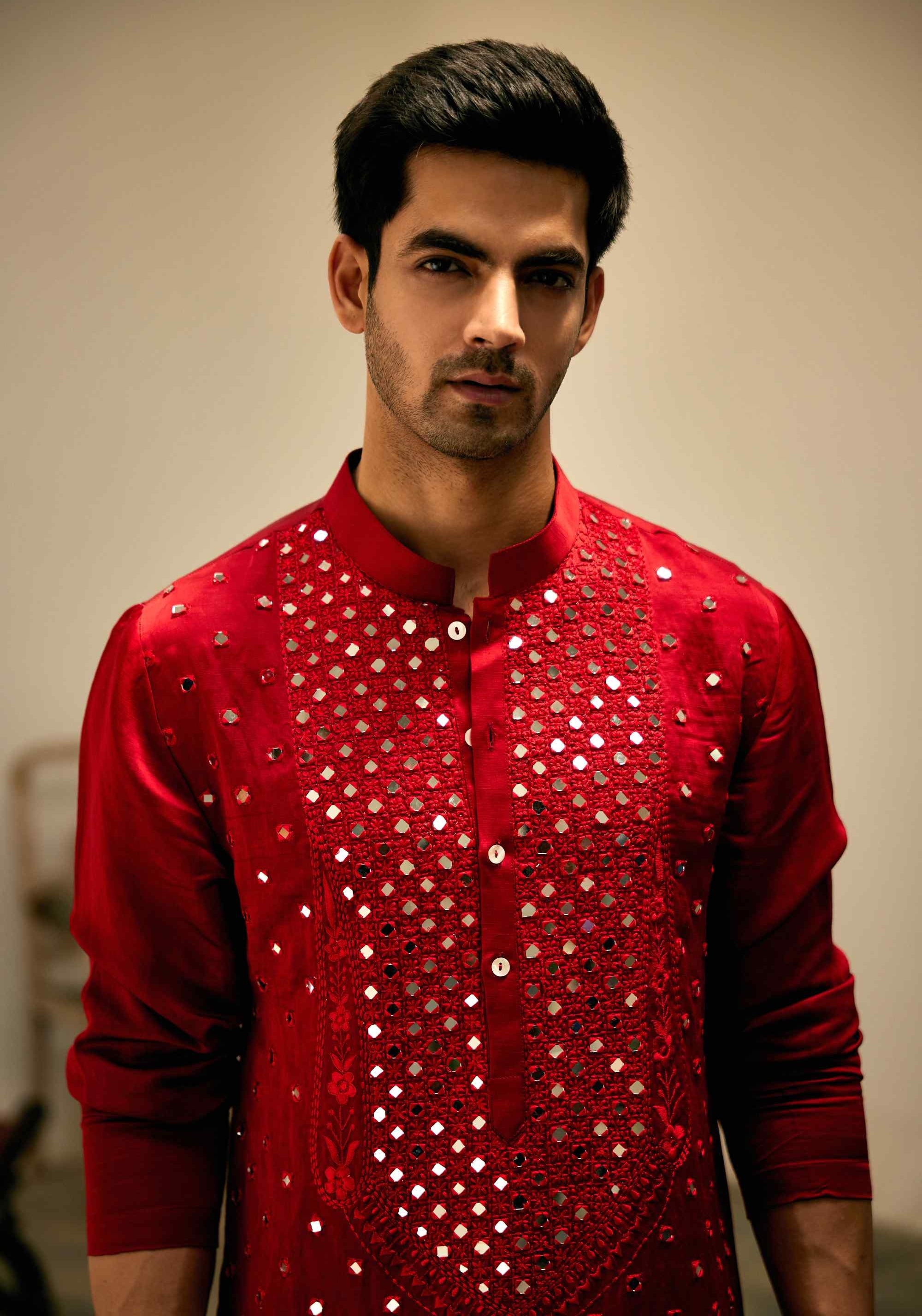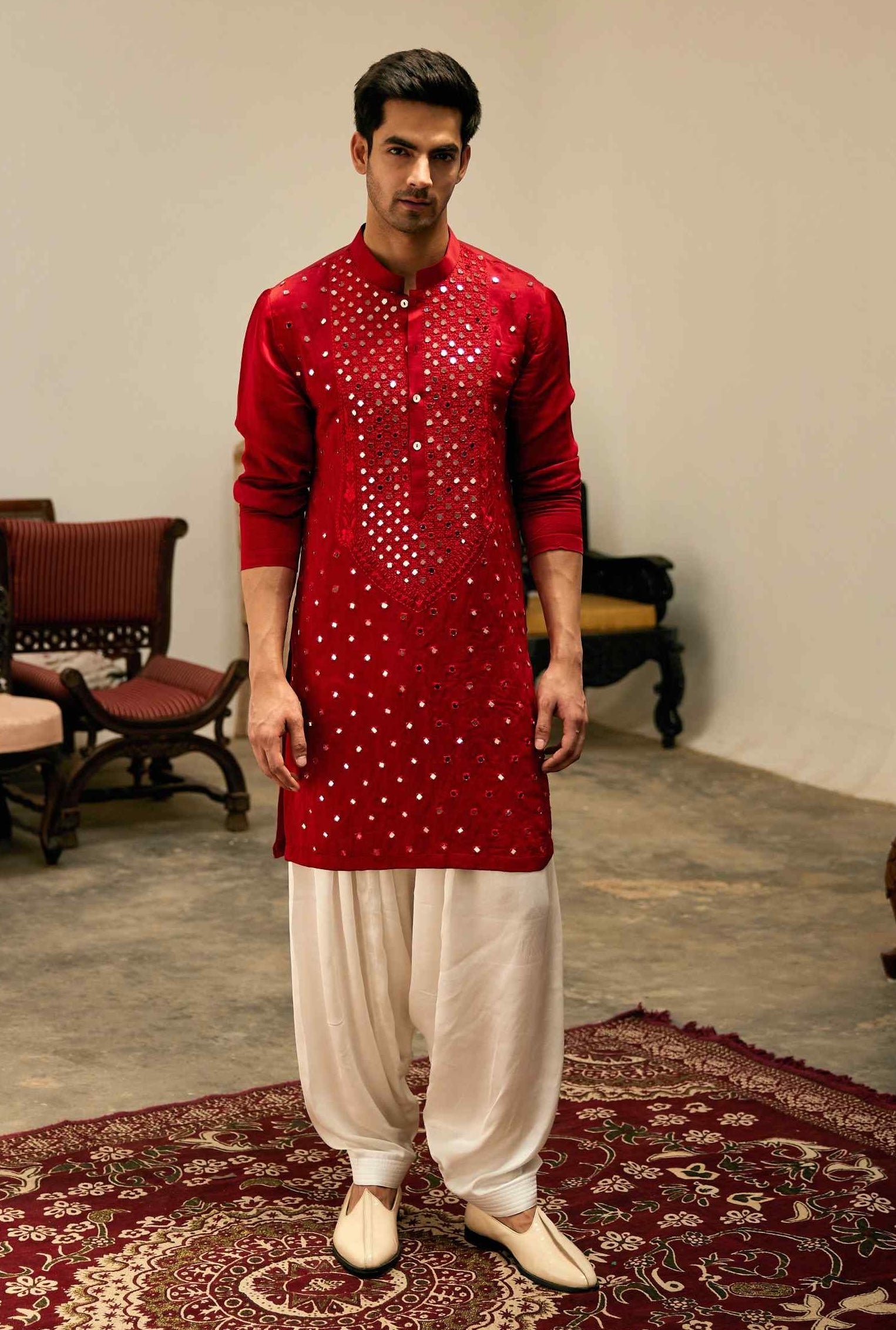 Make a striking impression with our Sindoor Red Mirror Work Kurta, a bold choice for the modern groom seeking to celebrate in style. This contemporary kurta, crafted with meticulous attention to detail, features genuine mirror work that adds a mesmerizing sparkle and depth. The vibrant Sindoor red hue ensures you'll stand out on your special day, capturing both elegance and energy. Complete with a coordinating salwar, this ensemble offers a seamless and refined look for any celebration of love and joy. Perfect for making a memorable statement, this kurta blends traditional craftsmanship with modern sophistication, making it an ideal choice for a standout occasion.