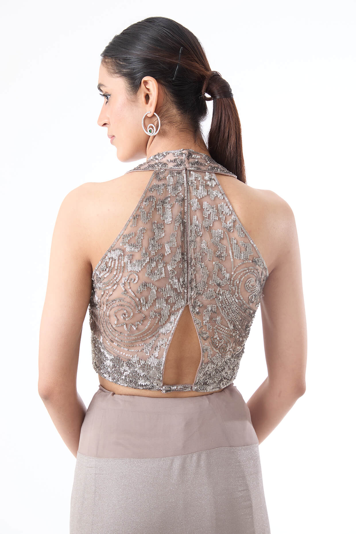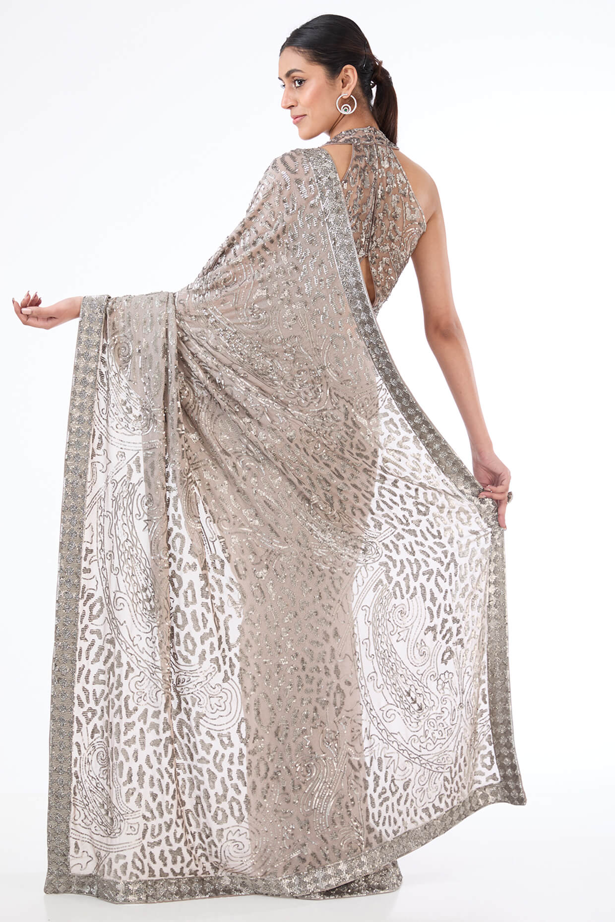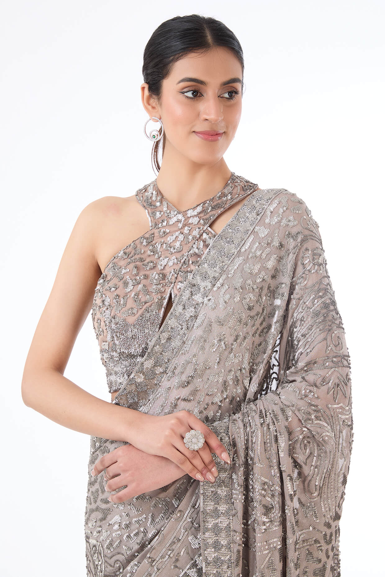The zaynab saree set in gray georgette is an exquisite ensemble that combines elegance with intricate craftsmanship. The saree features jaal hand embroidery, showcasing detailed and delicate patterns that enhance the sophisticated gray fabric. The soft georgette drapes beautifully, providing a graceful and flattering silhouette.