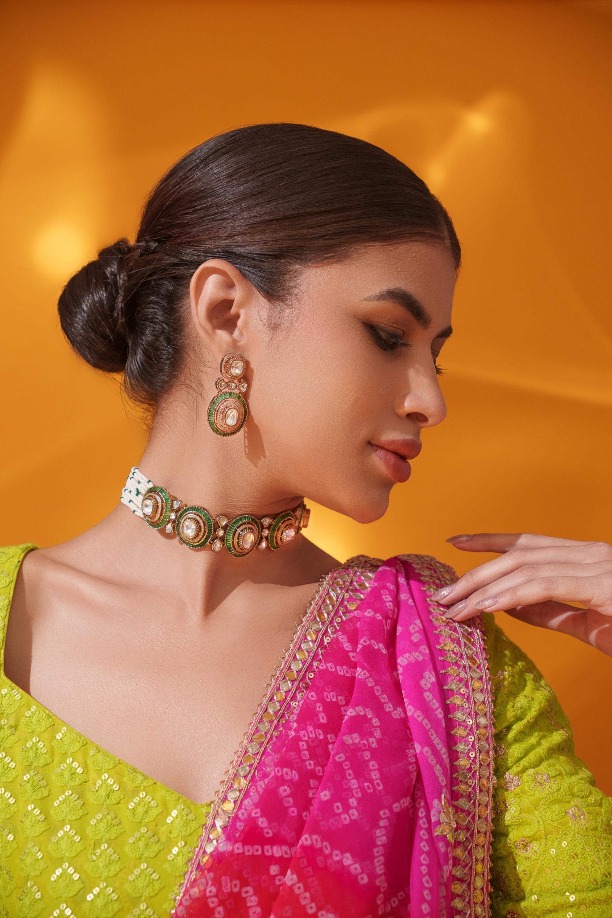 Elevate your festive look with this stunning green choker set from Zevar by Geeta. Crafted with precision, the bold green tones paired with intricate embellishments make it a statement accessory. Perfect for pairing with lehengas, sarees, or sharara sets, this choker set instantly adds regal charm to your outfit. Designed for weddings, receptions, or festive gatherings, it highlights your neckline while balancing tradition with contemporary elegance. If you’re looking to create a memorable look for an Indian celebration, this choker set will ensure you shine with sophistication and grace.
