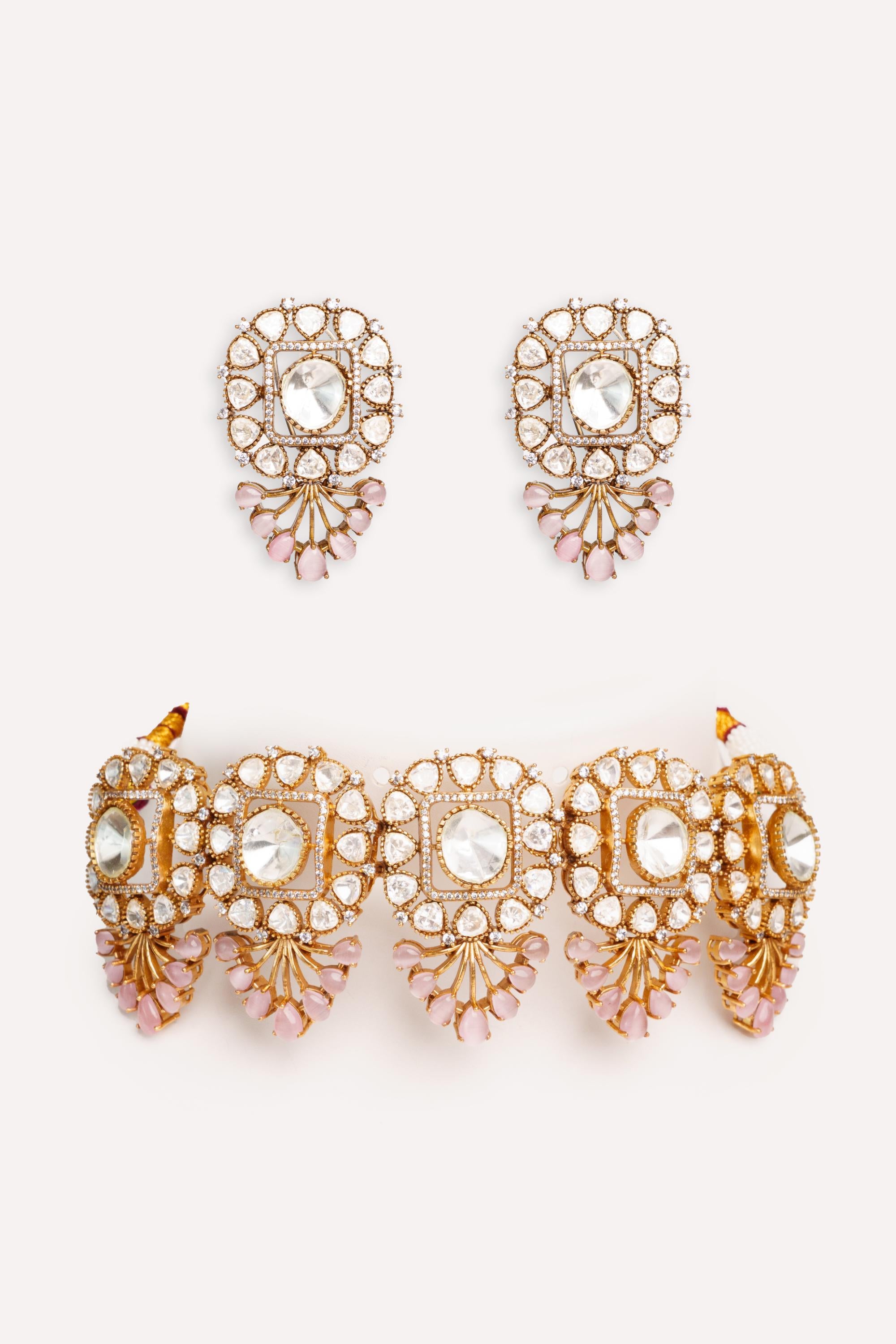 Celebrate festive elegance with the exquisite Pink Anura Polki Choker Set, a creation that redefines the artistry of traditional jewelry. This choker set is a symbol of timeless luxury, crafted with fine polki stones intricately set against a delicate pink finish, adding both grace and radiance to your festive attire. The rich design of the choker set draws inspiration from regal Indian heritage while maintaining a modern versatility that appeals to today’s discerning women. What makes this choker set truly special is its ability to stand as a statement piece while effortlessly complementing a variety of outfits. Whether paired with a silk saree, a traditional lehenga, or even a chic indo-western ensemble, the choker set enhances your look with elegance and grandeur. Its balanced combination of intricate detailing and comfortable wear ensures it remains a festive favorite for long hours of celebrations. Perfect for weddings, receptions, or festive gatherings, this choker set embodies the cultural richness of Indian jewelry while offering contemporary appeal. The touch of pink adds a subtle charm, making the choker set versatile for both daytime and evening occasions. For the woman who values tradition yet desires modern sophistication, the Pink Anura Polki Choker Set is not just an accessory but a statement of identity, confidence, and timeless beauty.
