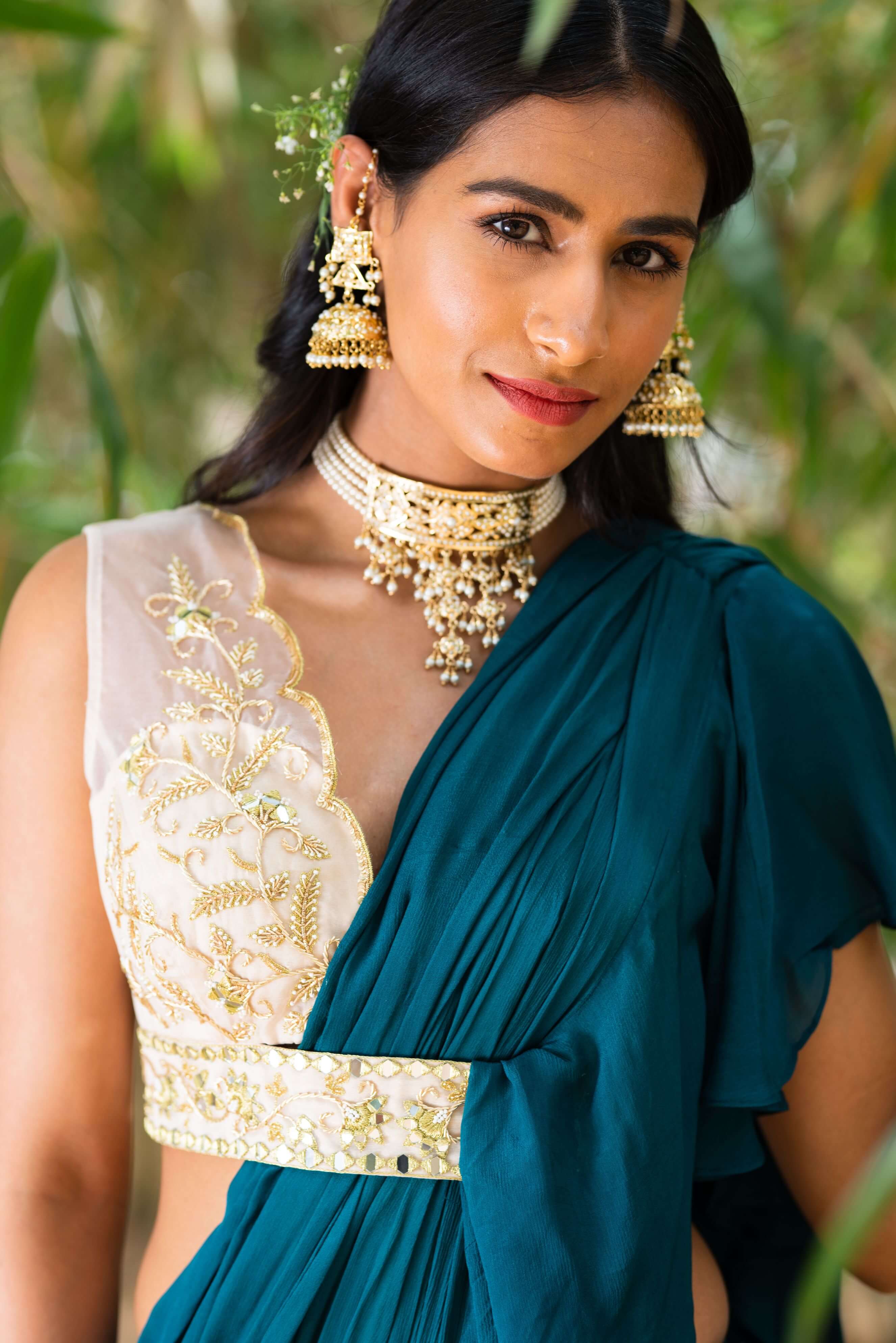 Step into elegance with the silk organza embroidered belted blouse paired gracefully with a teal green ruffled saree. The blouse, crafted from luxurious silk organza and adorned with delicate embroidery, exudes sophistication and charm. Complementing this ensemble is the teal green ruffled saree, which adds a touch of fluidity and grace to your attire. Perfect for special occasions and celebrations, this ensemble blends traditional craftsmanship with modern design, ensuring you stand out with refined style and timeless allure.